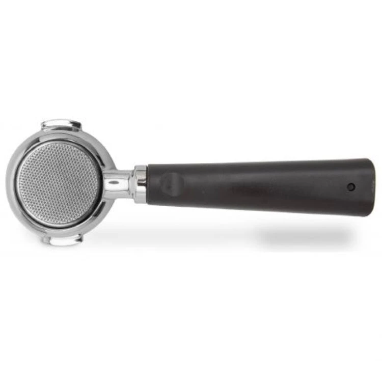 Lelit Bottomless filterholder with technopolymer handle IN brown with variable geometry for a functional support during the pressing, with LELIT logo on the bottom. Includes a stainless steel 2 doses filter (18-21 g), in collaboration with IMS. For machines with
