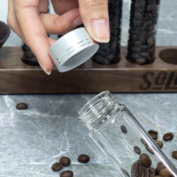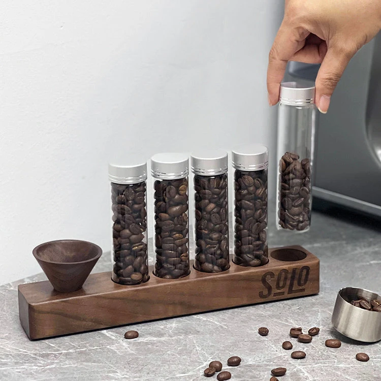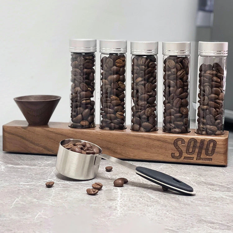 The set comprises 5 x 18-23g capacity tubes, perfect for single dosing for when you don’t want to weigh in the morning, or for quicker work flow. A custom walnut woodย funnel/hopper designed for the containers allows for easy filling.